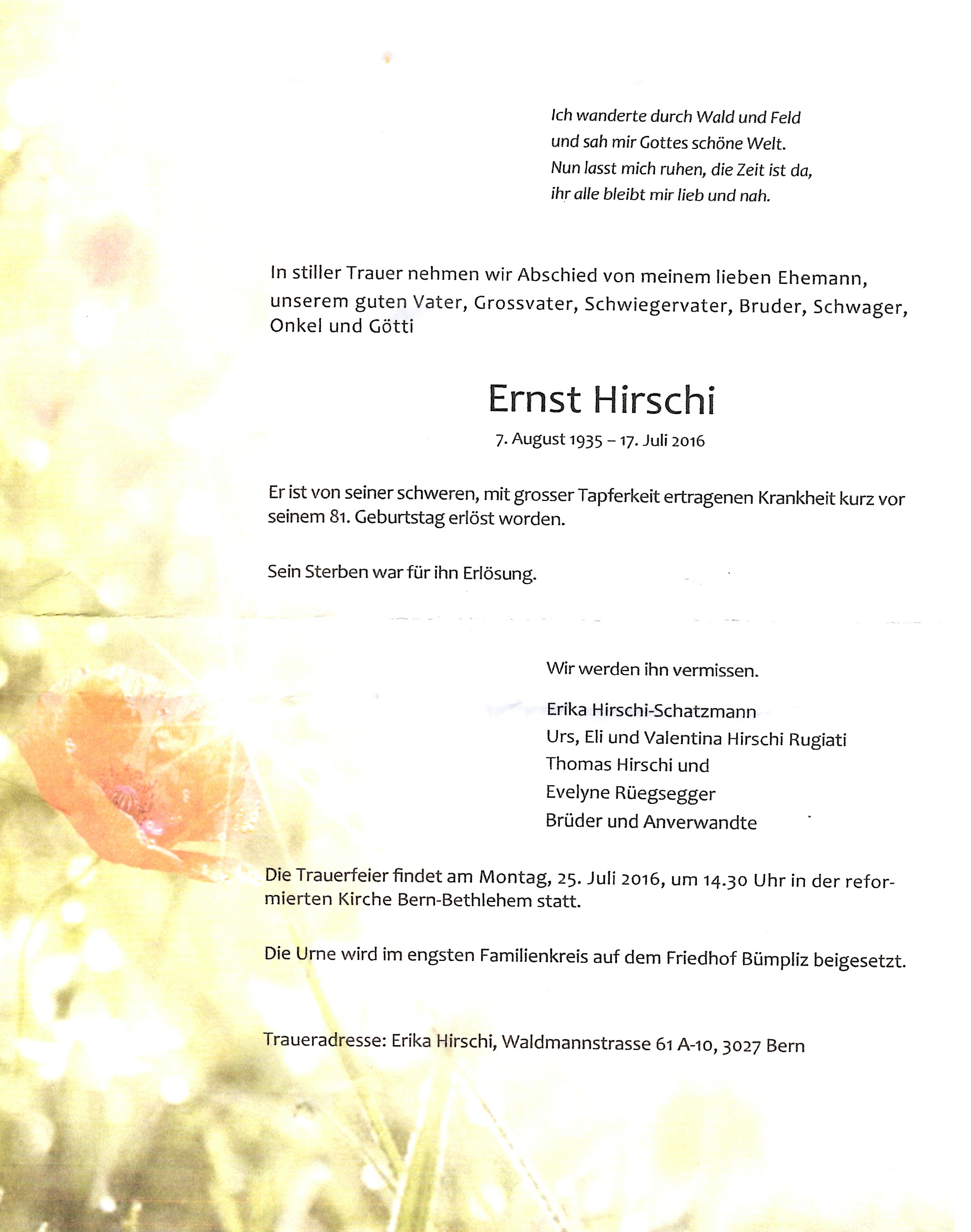 Am 17. Juli 2016 ist unser langjähriger Gartenkamerad Ernst Hirschi kurz vor seinem 81. Geburtstag verstorben.